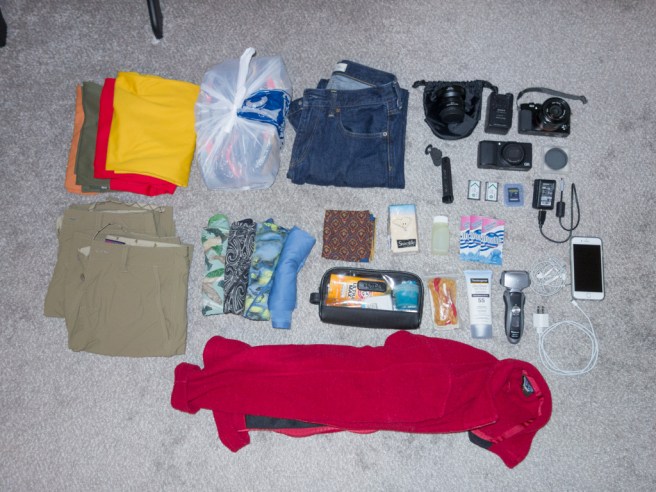 My luggage contents for this short week-long trip. The red fleece & hiking shoes are items I usually don’t need on most trips but were necessary for this one.