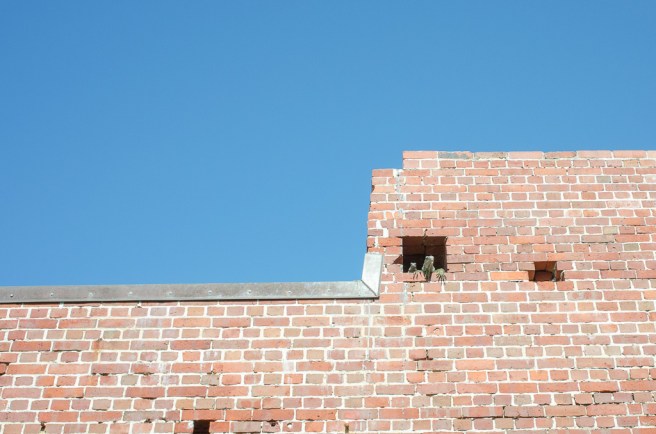 That big white area on the left side was a substantial chunk that was broken off by the storm and recently filled in with whatever building materials they use to re-form this type of structure. I assume it will eventually be painted over again at some point in the future.