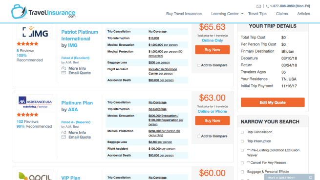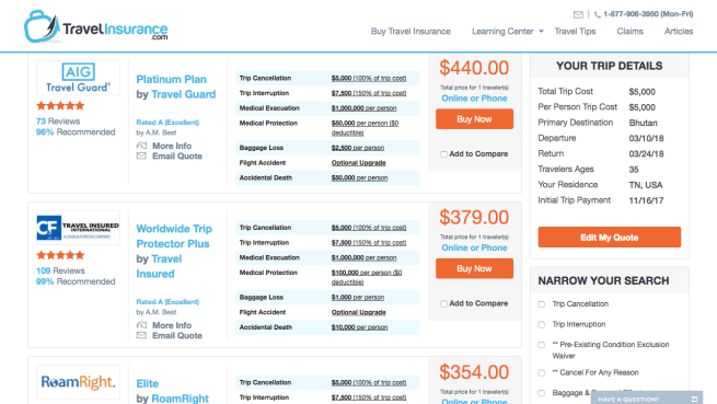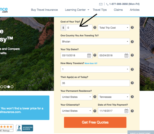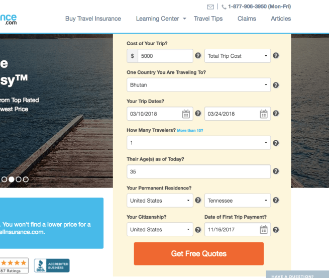 In the first example, let’s say we’re planning a solo 2 week trip to Bhutan, and the total trip costs are around $5000. We fill out all the boxes and click the box to see our free quotes:
