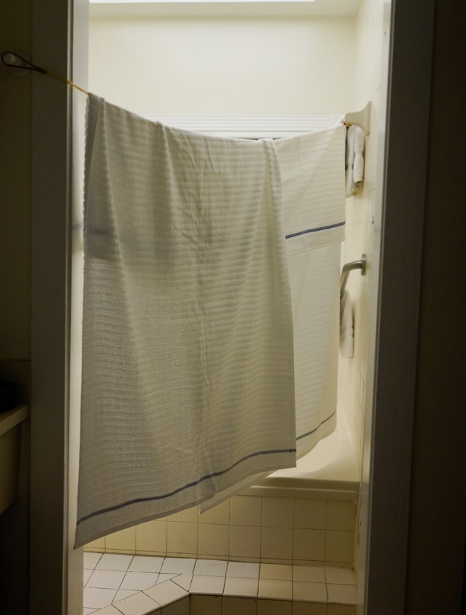 Dispirited, we shuffle back to the room and brainstorm for a solution to this conundrum. My Flexo-line! I’m sure there’s a way I can fashion it in such a way that we can throw either a bed sheet or some towels over it and create a temporary wall to separate the orgy tub from the rest of the room. With a little trial and error and a few extra towels, we were able to rig this up: