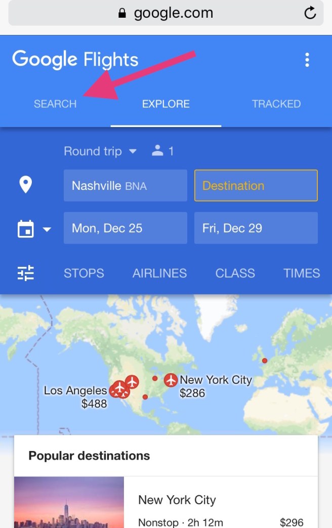One word of warning about Google Flights: if you use the mobile site on your phone, make sure you click on “Search” at the top left of your screen before you type in your request. The default setting for the mobile site is “Explore” for some inexplicable reason, so switch it over first so your search results make sense.