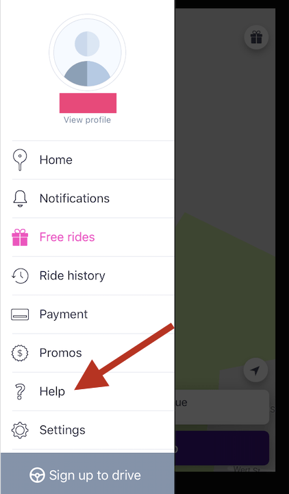 Open up the Lyft app and click on the small icon in the upper left of the screen that looks like a human head and shoulders. Once the menu’s open, click on Help: