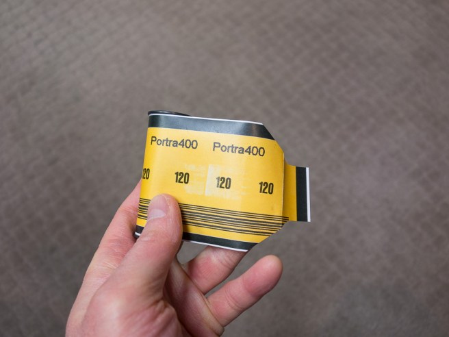 Once you’ve shot all 12 frames, continue winding the film advance knob and eventually you’ll feel the amount of resistance lessen and you will no longer see the film paper in the translucent red window. Pop the back off the camera off, carefully remove your completed roll of film, and secure it by lightly wetting the adhesive strip that wraps around the film roll and keeps it from unraveling.