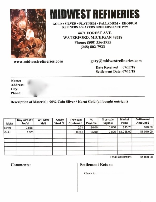 The option I settled on was a place in Michigan called Midwest Refineries. I found out about this place by doing a quick search on “how to sell gold” on bogleheads.org. Several people have had positive experiences with this business, so I thought I’d give it a shot.