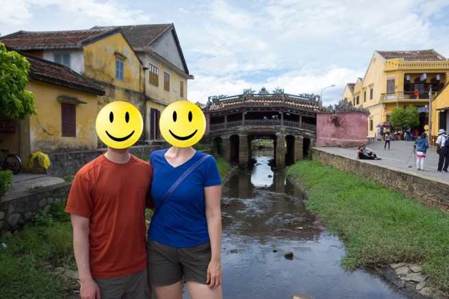 Another fine picture. The subjects (us) are a little off center so we’re not obstructing the background, but we’re not too far at the edge of the frame, and the famous Hoi-An bridge and colorful buildings are clearly visible. The overall proportions of the various elements in the photo are pleasing.