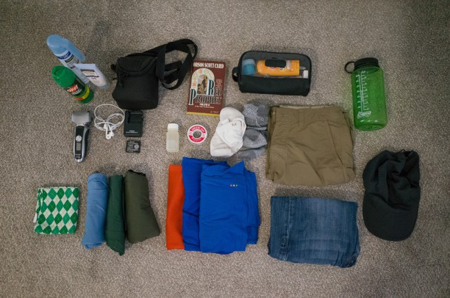 The above shows what I packed for this vacation. My usual pack list, plus some sunscreen, bug spray, hat, water bottle, and a pair of trail shoes (not shown in the photo). All of it fit nicely in my backpack with plenty of room to spare. We ended up buying a big bottle of water for our hike, so next time the Nalgene will stay at home.